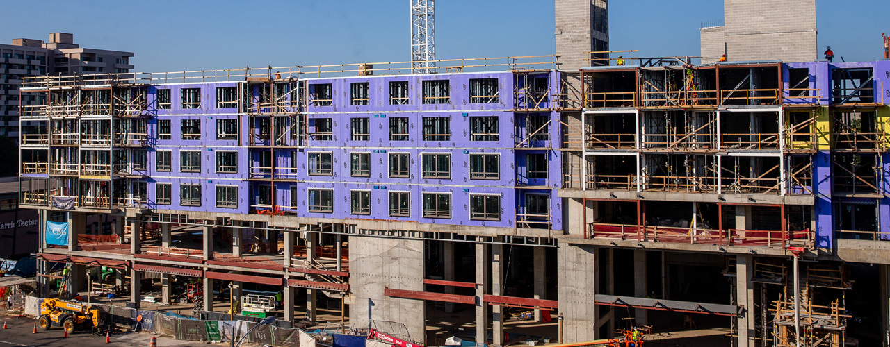Gold Bond® eXP® Sheathing provides a high-performance foundation in commercial construction with metal-framed steel studs. It serves as the substrate for various wall systems, creating a durable base for numerous claddings such as brick, stucco, metal panels or stone.