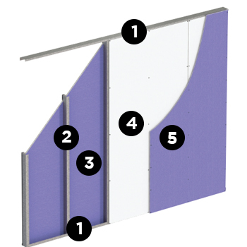 - 5/8" Gold Bond® Fire-Shield® Gypsum Board: Base layer that meets or exceeds ASTM C1629 Soft Body Impact Level 2 (195 foot-pounds).