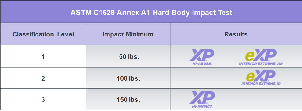 - 5/8" Gold Bond® XP® Hi-Impact® Gypsum Board: Face layer designed to achieve Hard Body Impact Level 3 (150 foot-pounds) protection.