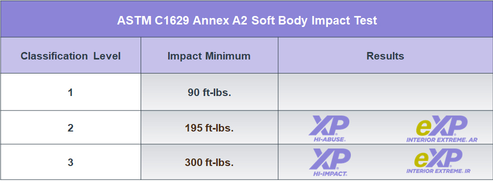 - Soft-body impact (Annex A2 of ASTM C1629): This measures how a wall holds up against larger, cushioned hits — think the force of a shoulder or elbow accidentally striking the surface. While these impacts don’t have sharp edges, they can still cause dents, cracks or surface damage if the wall isn’t properly reinforced.